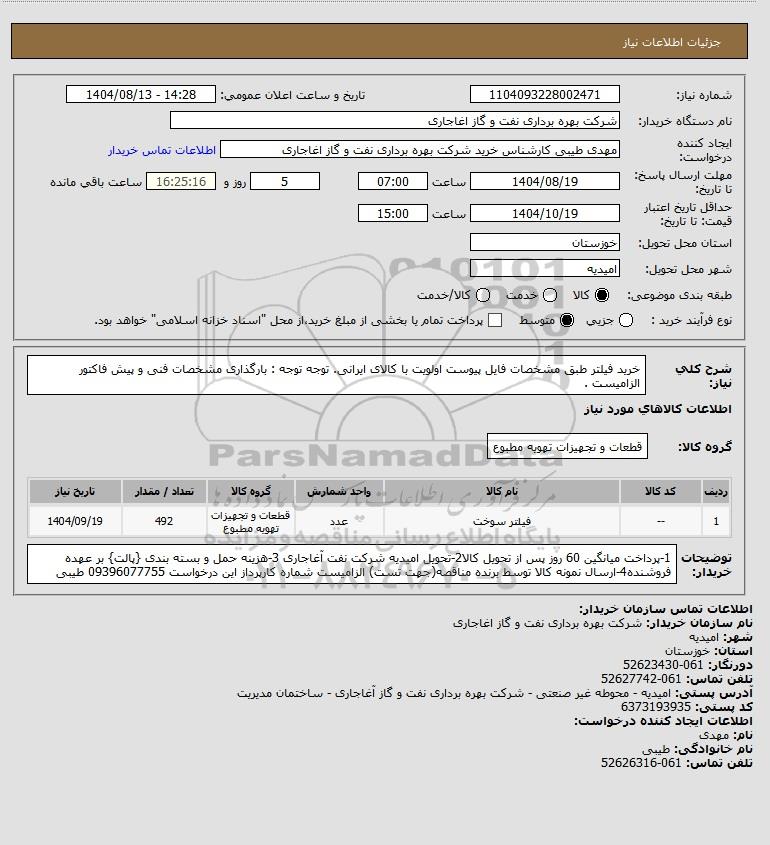 شرح کلی نیاز: خرید فیلتر طبق مشخصات فایل پیوست