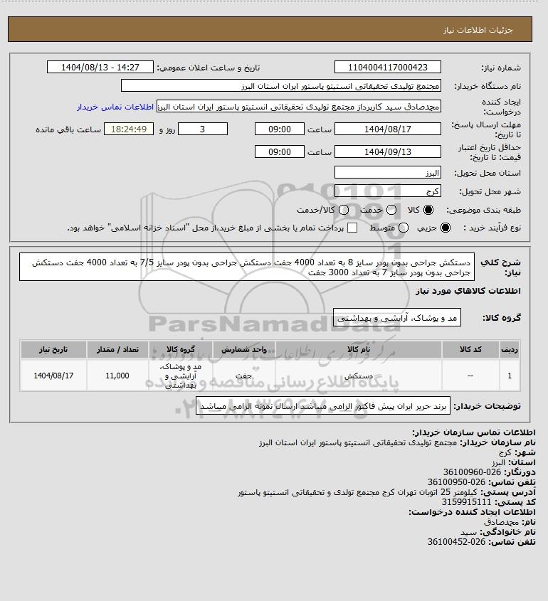 استعلام بها و موضوع استعلام استعلام دستکش جراحی بدون پودر سایز 8 به تعداد 4000 جفت دستکش جراحی بدون پودر سایز 7/5 به تعداد 4000 جفت دستکش جراحی بدون پودر سایز 7 به تعداد 3000 جفت به اطلاع کلیه شرکتها و افراد متخصص واجد شرایط میرساند، آگهی گذار در نظر دارد از طریق استعلام بها، نسبت به انتخاب و دریافت پیشنهادات اقدام نماید. این استعلام با کد آگهی ثبت شده در سامانه خبرگزاری پارس نماد : 9801357 منتشر شده است. مشخصات استعلام : تاریخ شروع استعلام: 1404/08/13 آخرین مهلت ارسال پیشنهاد قیمت : 1404/08/17 و محل اجرای پروژه : استان البرز میباشد. استعلام قیمت مورد درخواست : استعلام دستکش جراحی بدون پودر سایز 8 به تعداد 4000 جفت دستکش جراحی بدون پودر سایز 7/5 به تعداد 4000 جفت دستکش جراحی بدون پودر سایز 7 به تعداد 3000 جفت با دستهبندیهای تخصصی و گروه های مرتبط : خدمات و تجهیزات آزمایشگاهی و پزشکی, استعلام اطلاع رسانی میگردد.