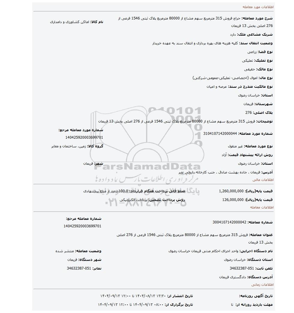 | شرح مورد معامله: حراج فروش 315 مترمربع سهم مشاع از 80000 مترمربع پلاک ثبتی 1546 فرعی از 276 اصلی بخش 13 فریمان | نام کالا: اماکن کشاورزی و دامداری | |