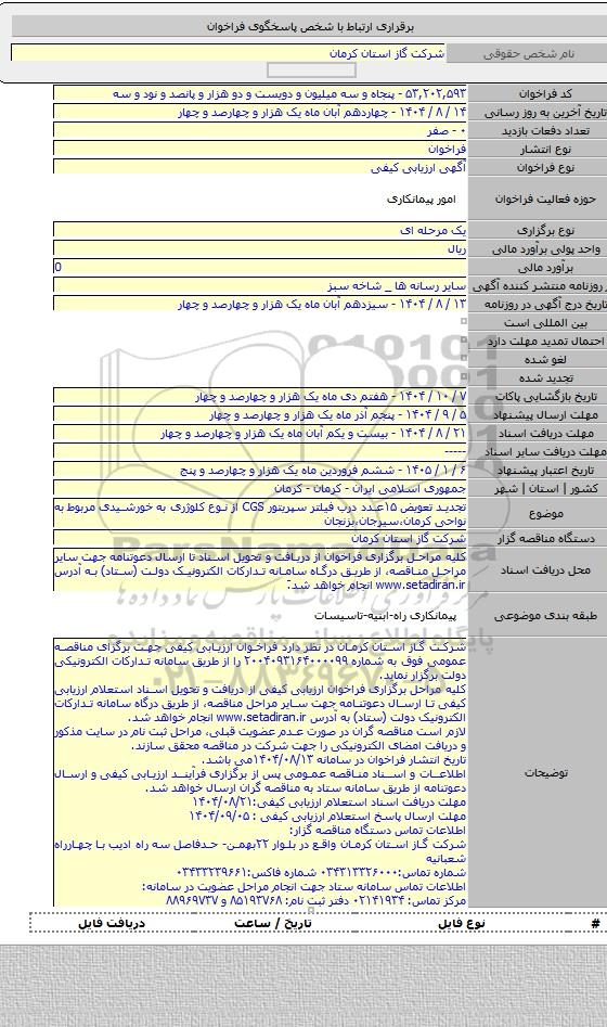 شرکت گاز استان کرمان در نظر دارد فراخوان ارزیابی کیفی جهت برگزای مناقصه عمومی فوق به شماره ۲۰۰۴۰۹۳۱۶۴۰۰۰۰۹۹ را از طریق سامانه تدارکات الکترونیکی دولت برگزار نماید.