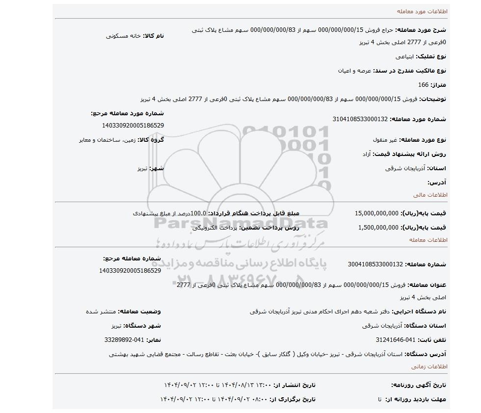 | شرح مورد معامله: حراج فروش 000/000/000/15 سهم از 000/000/000/83 سهم مشاع پلاک ثبتی 0فرعی از 2777 اصلی بخش 4 تبریز | نام کالا: خانه مسکونی | |
