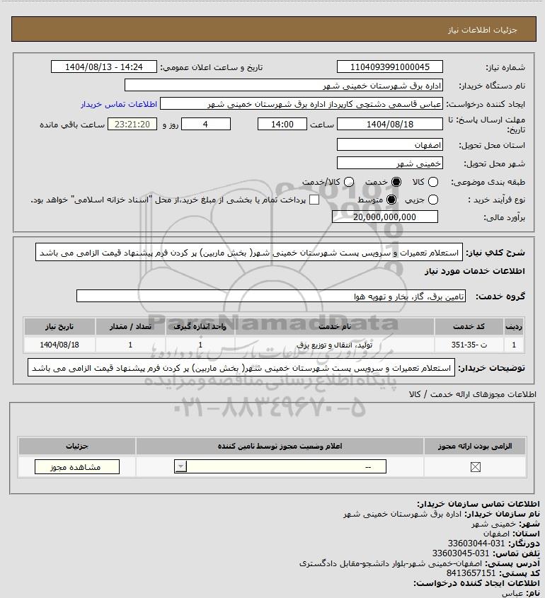 شرح کلی نیاز: استعلام تعمیرات و سرویس پست شهرستان خمینی شهر( بخش ماربین)
