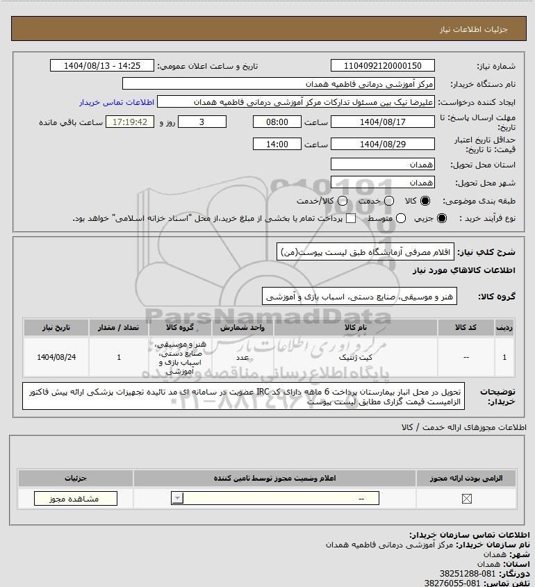 | 1 | -- | کیت ژنتیک | عدد | هنر و موسیقی، صنایع دستی، اسباب بازی و آموزشی | 1 | 1404/08/24 |