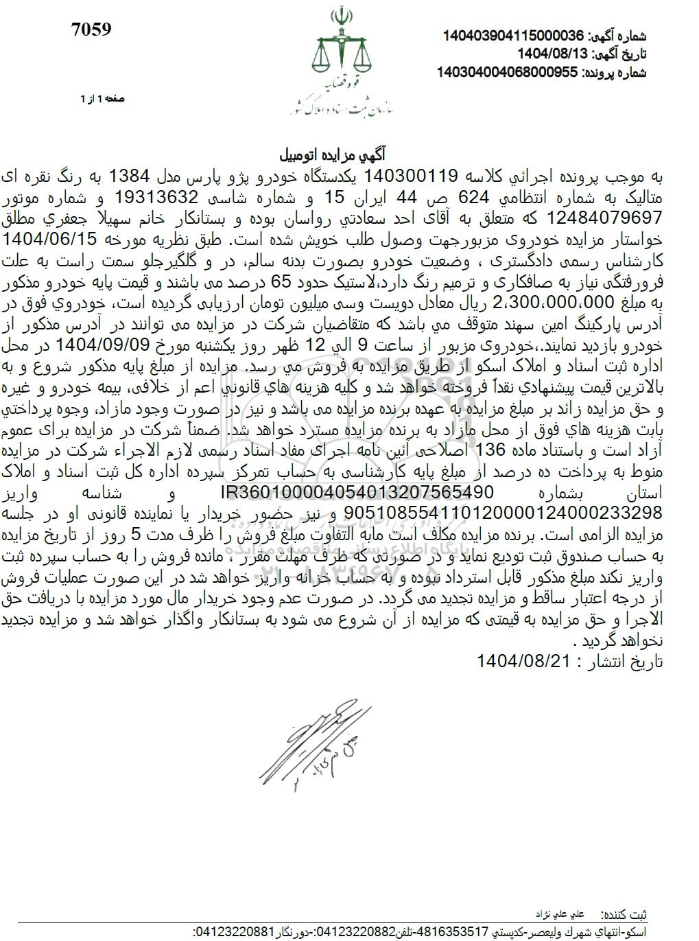 به موجب پرونده اجرائي كلاسه 140300119 یکدستگاه خودرو پژو پارس مدل 1384 به رنگ نقره ای متالیک به شماره انتظامي 624 ص 44 ایران 15 و شماره شاسی 19313632 و شماره موتور 12484079697 که متعلق به آقای احد سعادتي رواسان بوده و بستانکار خانم سهيلا جعفري مطلق خواستار مزایده خودروی مزبور جهت وصول طلب خویش شده است. طبق نظریه مورخه 1404/06/15 کارشناس رسمی دادگستری، وضعیت خودرو بصورت بدنه سالم در و گلگیر جلو سمت راست به علت فرورفتگی نیاز به صافکاری و ترمیم رنگ دارد لاستیک حدود 65 درصد می باشند و قیمت پایه خودرو مذکور به مبلغ 2,300,000,000 ريال معادل دویست و سی میلیون تومان ارزیابی گردیده است، خودروی فوق در آدرس پارکینگ امین سهند متوقف می باشد که متقاضیان شرکت در مزایده میتوانند در آدرس مذکور از خودرو بازدید نمایند. خودروی مزبور از ساعت 9 الي 12 ظهر روز یکشنبه مورخ 1404.09.09 در محل اداره ثبت اسناد و املاک اسکو از طریق مزایده به فروش میرسد. مزایده از مبلغ پایه مذکور شروع و به بالاترین قیمت پیشنهادی نقداً فروخته خواهد شد و کلیه هزينه هاي قانوني اعم از خلافی بیمه خودرو و غیره و حق مزایده زائد بر مبلغ مزایده به عهده برنده مزایده میباشد و نیز در صورت وجود مازاد وجوه پرداختی بابت هزینه های فوق از محل مازاد به برنده مزایده مسترد خواهد شد. ضمناً شرکت در مزایده برای عموم آزاد است و باستناد ماده 136 اصلاحی آئین نامه اجرای مفاد اسناد رسمى لازم الاجراء شرکت در مزایده منوط به پرداخت ده درصد از مبلغ پایه کارشناسی به حساب تمرکز سپرده اداره کل ثبت اسناد و املاک استان بشماره IR360100004054013207565490 شناسه 905108554110120000124000233298 و نیز حضور خریدار یا نماینده قانونی او در جلسه