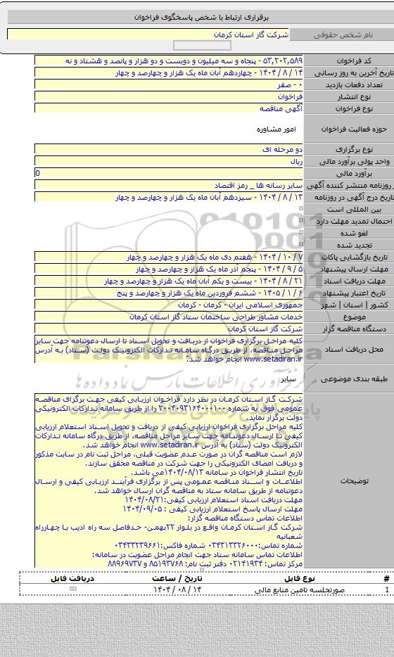 مناقصه خدمات مشاور طراحی ساختمان ستاد گاز استان کرمان از کلیه افراد متخصص و شرکتها واجد شرایط دعوت به عمل میآید در مناقصه با کد خبرگزاری پارس نماد: 9801476 شرکت نمایند.