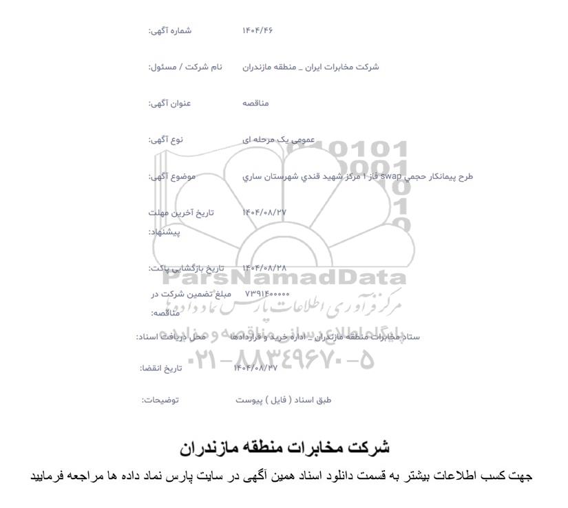 موضوع آگهی: طرح پیمانکار حجمی swap فاز 1 مرکز شهید قندی شهرستان ساری