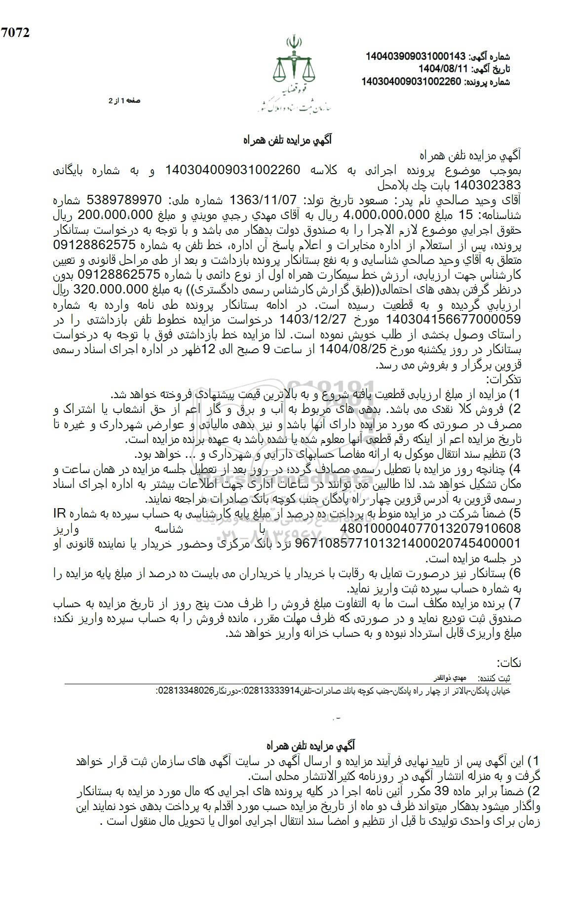آقای وحید صالحی نام پدر مسعود تاریخ تولد: 1363/11/07 شماره ملی 5389789970 شماره شناسنامه 15 مبلغ 4.000.000.000 ریال به آقاى مهدی رجبی موینی و مبلغ 200.000.000 ریال حقوق اجرایی موضوع لازم الاجرا را به صندوق دولت بدهکار میباشد و با توجه به درخواست بستانکار پرونده، پس از استعلام از اداره مخابرات و اعلام پاسخ آن اداره خط تلفن به شماره 09128862575 متعلق به آقای وحید صالحی شناسایی و به نفع بستانکار پرونده بازداشت و بعد از طی مراحل قانونی و تعیین کارشناس جهت ارزیابی ارزش خط سیمکارت همراه اول از نوع دائمی با شماره 09128862575 بدون در نظر گرفتن بدهی های احتمالی طبق گزارش کارشناس رسمی دادگستری به مبلغ 320.000.000 ریال ارزیابی گردیده و به قطعیت رسیده است. در ادامه بستانکار پرونده طی نامه وارده به شماره 140304156677000059 مورخ 1403.12.27 درخواست مزایده خطوط تلفن بازداشتی را در راستای وصول بخشی از طلب خویش نموده است. لذا مزایده خط بازداشتی فوق با توجه به درخواست بستانکار در روز یکشنبه مورخ 1404.08.25 از ساعت 9 صبح الی 12 ظهر در اداره اجرای اسناد رسمی قزوین برگزار و بفروش می رسد.