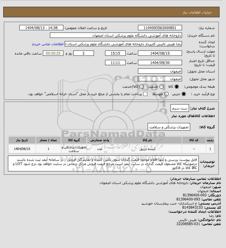 | 1 | -- | کیسه تزریق | عدد | تجهیزات پزشکی و سلامت | 1 | 1404/08/15 |
