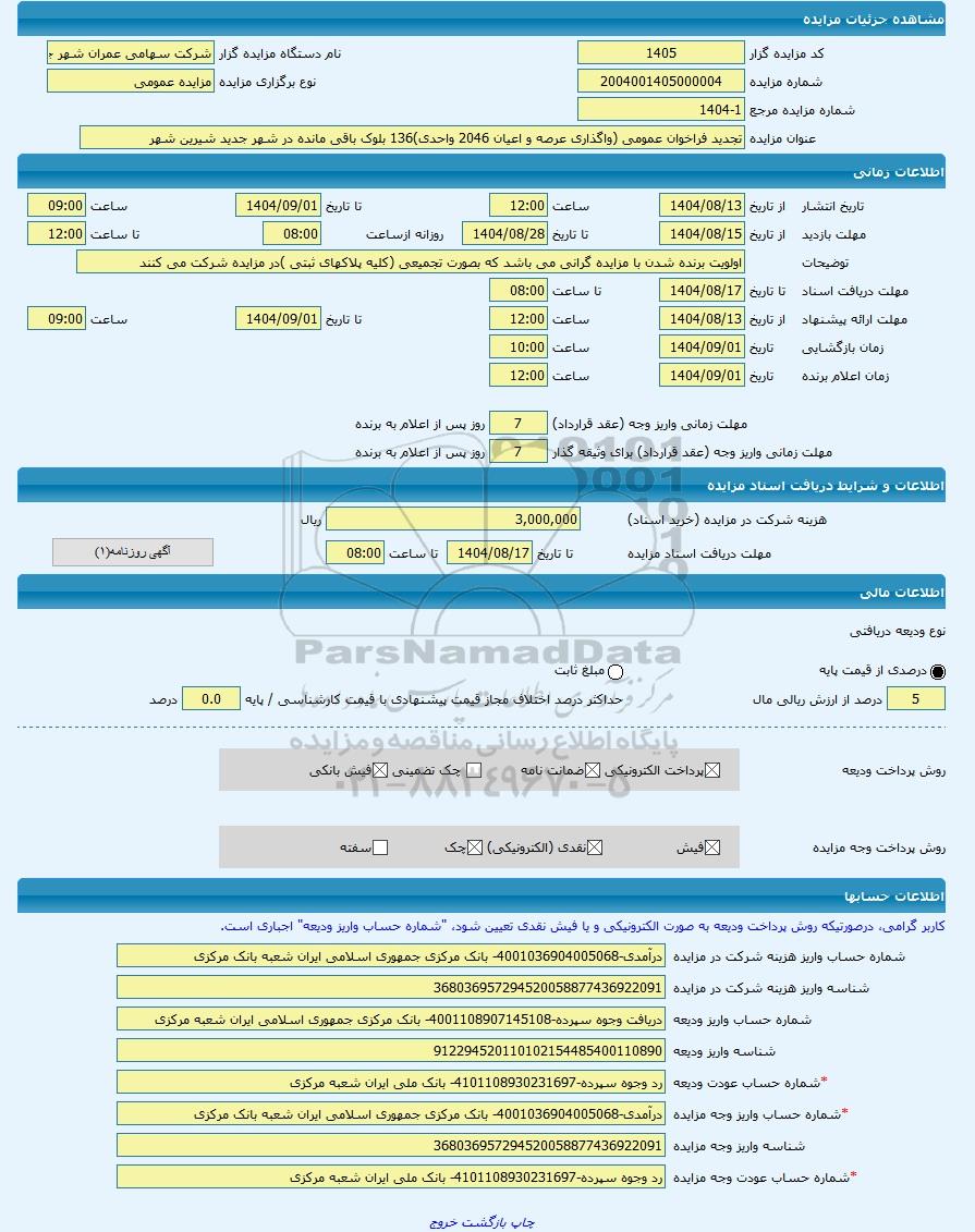 مزایده عمومی مزایده تجدید فراخوان عمومی (واگذاری عرصه و اعیان 2046 واحدی)136 بلوک باقی مانده در شهر جدید شیرین شهر -مزایده ساختمان - استان برگزار میگردد. از کلیه افراد متخصص و شرکت‌های واجد شرایط دعوت به عمل می‌آید تا در این مزایده با کد خبرگزاری پارس نماد : 9801554 شرکت نمایند تاریخ شروع مزایده : 1404/08/13 مهلت شرکت در مزایده: تا پایان روز 1404/08/17 مکان برگزاری اموال واگذاری استان‌های خوزستان و دسته‌بندی‌های مربوط به این حراجی واگذاری ورزشگاه، پارکینگ، غرفه و بوفه, املاک و زمین میباشد.