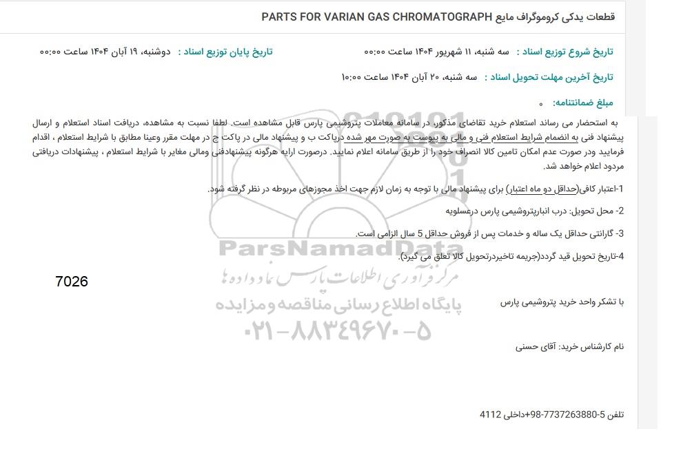 استعلام بها و موضوع استعلام استعلام قطعات یدکی کروموگراف مایع PARTS FOR VARIAN GAS CHROMATOGRAPH به اطلاع کلیه شرکتها و افراد متخصص واجد شرایط میرساند، آگهی گذار در نظر دارد از طریق استعلام بها، نسبت به انتخاب و دریافت پیشنهادات اقدام نماید. این استعلام با کد آگهی ثبت شده در سامانه خبرگزاری پارس نماد : 9801616 منتشر شده است. مشخصات استعلام : تاریخ شروع استعلام: 1404/08/13 آخرین مهلت ارسال پیشنهاد قیمت : 1404/08/19 و محل اجرای پروژه : استان بوشهر میباشد. استعلام قیمت مورد درخواست : استعلام قطعات یدکی کروموگراف مایع PARTS FOR VARIAN GAS CHROMATOGRAPH با دستهبندیهای تخصصی و گروه های مرتبط : ابزار دقیق, خدمات و تجهیزات آزمایشگاهی و پزشکی, تجهیزات نفت و گاز, استعلام اطلاع رسانی میگردد.