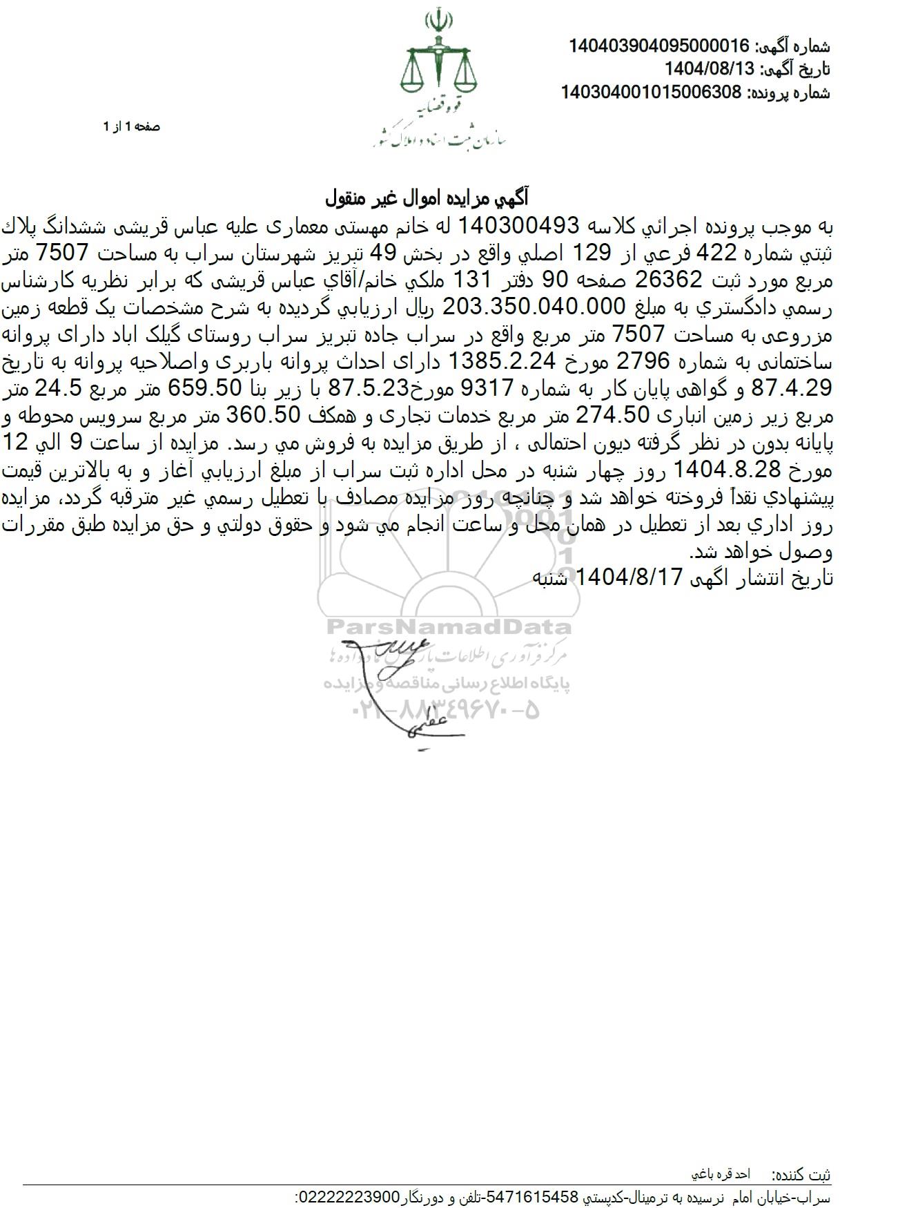به موجب پرونده اجرائی کلاسه 140300493 له خانم مهستی معماری علیه عباس قریشی ششدانگ پلاک ثبتی شماره 422 فرعی از 129 اصلی واقع در بخش 49 تبریز شهرستان سراب به مساحت 7507 متر مربع مورد ثبت 26362 صفحه 90 دفتر 131 ملکی خانم . آقای عباس قریشی که برابر نظریه کارشناس رسمی دادگستری به مبلغ 203.350.040.000 ریال ارزیابی گردیده به شرح مشخصات یک قطعه زمین مزروعی به مساحت 7507 متر مربع واقع در سراب جاده تبریز سراب روستای گیلک آباد دارای پروانه ساختمانی به شماره 2796 مورخ 1385.2.24 دارای احداث پروانه باربری و اصلاحیه پروانه به تاریخ 87.4.29 و گواهی پایان کار به شماره 9317 مورخ 87.5.23 با زیر بنا 659.50 متر مربع 24.5 متر مربع زیر زمین انباری 274.50 متر مربع خدمات تجاری و همکف 360.50 متر مربع سرویس محوطه و پایانه بدون در نظر گرفته دیون احتمالی، از طریق مزایده به فروش میرسد. مزایده از ساعت 9 الی 12 مورخ 1404.8.28 روز چهار شنبه در محل اداره ثبت سراب از مبلغ ارزیابی آغاز و به بالاترین قیمت پیشنهادی نقدا فروخته خواهد شد و چنانچه روز مزایده مصادف با تعطیل رسمی غیر مترقبه گردد، مزایده روز اداری بعد از تعطیل در همان محل و ساعت انجام می شود و حقوق دولتی و حق مزایده طبق مقررات وصول خواهد شد.