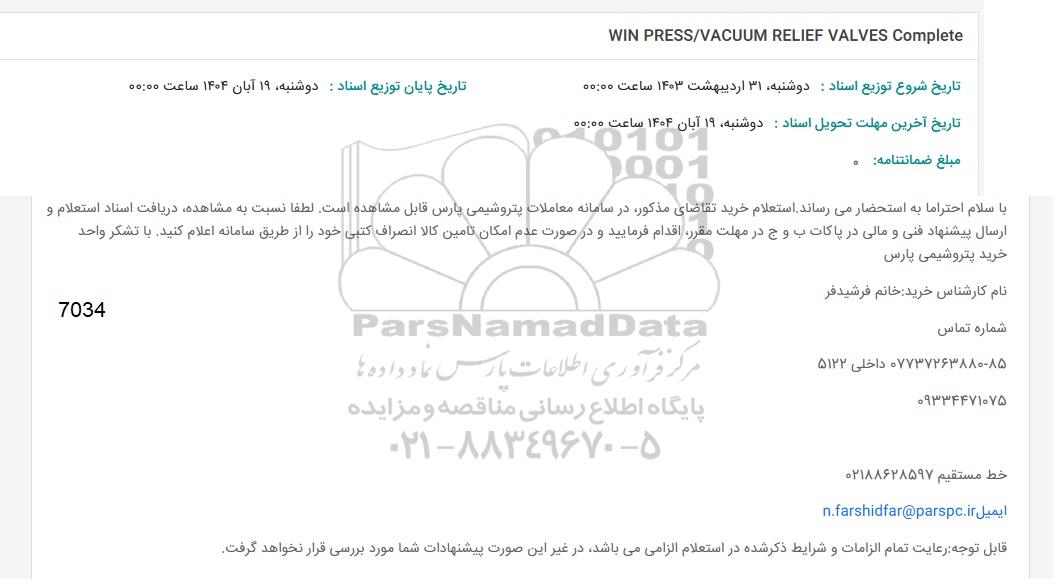 با سلام احتراما به استحضار میرساند. استعلام خرید تقاضای مذکور در سامانه معاملات پتروشیمی پارس قابل مشاهده است. لطفا نسبت به مشاهده دریافت اسناد استعلام و ارسال پیشنهاد فنی و مالی در پاکات ب و ج در مهلت مقرر اقدام فرمایید و در صورت عدم امکان تامین کالا انصراف کتبی خود را از طریق سامانه اعلام کنید. با تشکر واحد خرید پتروشیمی پارس
