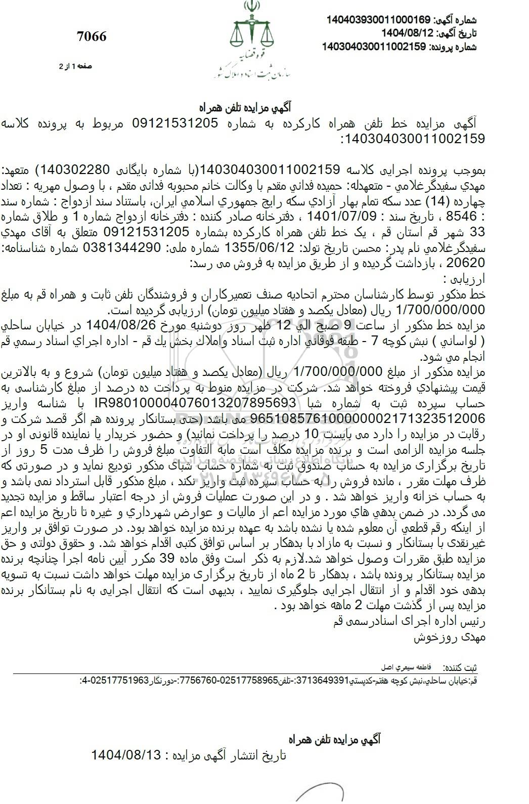 بموجب پرونده اجرایی کلاسه 140304030011002159 با شماره بایگانی 140302280) متعهد مهدی سفید گر غلامی - متعهدله حمیده فدائی مقدم با وکالت خانم محبوبه فدائی مقدم ، با وصول مهریه : تعداد چهارده (14) عدد سکه تمام بهار آزادی سکه رایج جمهوری اسلامی ایران باستناد سند ازدواج : شماره سند : 8546 ، تاریخ سند : 1401.07.09 ، دفترخانه صادر کننده : دفترخانه ازدواج شماره 1 و طلاق شماره 33 شهر قم استان قم ، یک خط تلفن همراه کار کرده بشماره 09121531205 متعلق به آقای مهدی سفید گر غلامی نام پدر محسن تاریخ تولد 1355.06.12 شماره ملی 0381344290 شماره شناسنامه 20620 ، بازداشت گردیده و از طریق مزایده به فروش می رسد