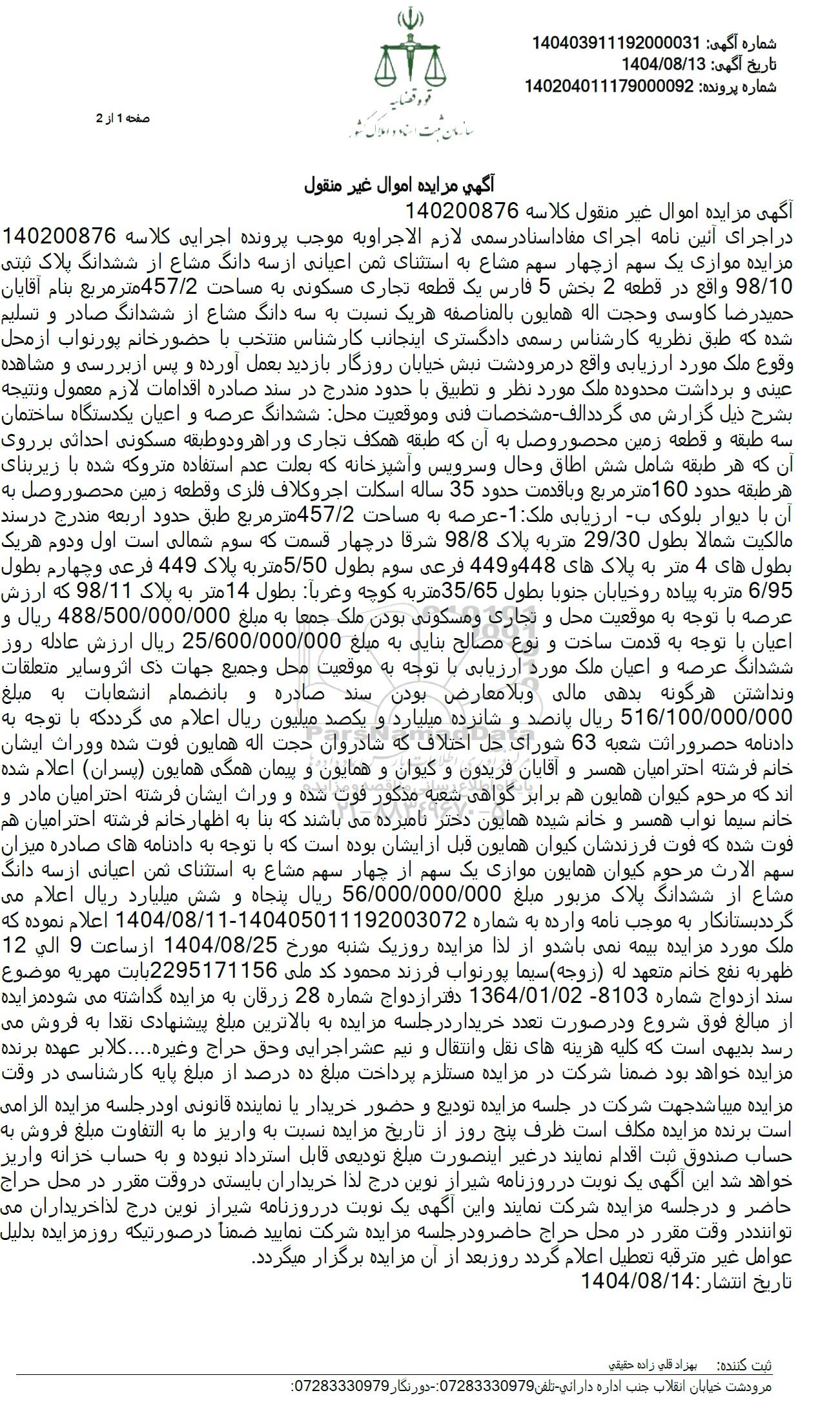 آگهی مزایده اموال غیر منقول کلاسه 140200876 در اجرای آئین نامه اجرای مفاد اسناد رسمی لازم الاجراويه موجب پرونده اجرایی کلاسه 140200876 مزایده موازی یک سهم از چهار سهم مشاع به استثنای ثمن اعیانی از سه دانگ مشاع از ششدانگ پلاک ثبتی 98.10 واقع در قطعه 2 بخش 5 فارس یک قطعه تجاری مسکونی به مساحت 457.2 متر مربع بنام آقایان حمیدرضا کاوسی و حجت اله همايون بالمناصفه هر یک نسبت به سه دانگ مشاع از ششدانگ صادر و تسلیم شده که طبق نظریه کارشناس رسمی دادگستری اینجانب کارشناس منتخب با حضور خانم پورنواب از محل وقوع ملک مورد ارزیابی واقع در مرودشت نبش خیابان روزگار بازدید بعمل آورده و پس از بررسی و مشاهده عینی و برداشت محدوده ملک مورد نظر و تطبیق با حدود مندرج در سند صادره اقدامات لازم معمول و نتيجه بشرح ذیل گزارش میگردد الف - مشخصات فني و موقعيت محل ششدانگ عرصه و اعیان یکدستگاه ساختمان سه طبقه و قطعه زمین محصور وصل به آن که طبقه همکف تجاری و راهرو دو طبقه مسکونی احداثی برروی آن که هر طبقه شامل شش اطاق و حال و سرویس و آشپزخانه که بعلت عدم استفاده متروکه شده با زیربنای هر طبقه حدود 160 متر مربع و با قدمت حدود 35 ساله اسکلت اجر و کلاف فلزی و قطعه زمین محصور وصل به آن با دیوار بلوکی - ارزیابی ملک -1 - عرصه به مساحت 457.2 متر مربع طبق حدود اربعه مندرج درسند مالكيت شمالا بطول 29.30 متر به پلاک 98.8 شرقا در چهار قسمت که سوم شمالی است اول و دوم هر یک بطولهای 4 متر به پلاکهای 448 و 449 فرعى سوم بطول 5.50 متر به پلاک 449 فرعی و چهارم بطول 6.95 متر به پیاده روخیابان جنوبا بطول 35.65 متر به کوچه و غرباً بطول 14 متر به پلاک 98.11 که ارزش عرصه با توجه به موقعیت محل و تجاری و مسکونی بودن ملک جمعا به مبلغ 488.500.000.000 ريال و اعیان با توجه به قدمت ساخت و نوع مصالح بنایی به مبلغ 25.600.000.000 ريال ارزش عادله روز ششدانگ عرصه و اعیان ملک مورد ارزیابی با توجه به موقعیت محل وجميع جهات دی اثر وسایر متعلقات و نداشتن هرگونه بدهی مالی و بلا معارض بودن سند صادره و بانضمام انشعابات به مبلغ 516.100.000.000 ریال پانصد و شانزده میلیارد و یکصد میلیون ریال اعلام می گردد که با توجه به دادنامه حصر وراثت شعبه 63 شورای حل اختلاف که شادروان حجت اله همایون فوت شده وورات ایشان خانم فرشته احترامیان همسر و آقایان فریدون و کیوان و همایون و پیمان همگی همایون (پسران) اعلام شده اند که مرحوم کیوان همایون هم برابر گواهی شعبه مذکور فوت شده و ورات ایشان فرشته احترامیان مادر و خانم سیما نواب همسر و خانم شیده همایون دختر نامبرده میباشند که بنا به اظهار خانم فرشته احترامیان هم فوت شده که فوت فرزندشان کیوان همایون قبل از ایشان بوده است که با توجه به دادنامه های صادره میزان سهم الارث مرحوم کیوان همایون موازی یک سهم از چهار سهم مشاع به استثنای تمن اعیانی از سه دانگ مشاع از ششدانگ پلاک مزبور مبلغ 56.000.000.000 ریال پنجاه و شش میلیارد ریال اعلام می گردد بستانکار به موجب نامه وارده به شماره 140405011192003072-1404.08.11 اعلام نموده که ملک مورد مزایده بیمه نمی باشد و از لذا مزایده روز یک شنبه مورخ 1404.08.25 ارساعت 9 الی 12 ظهر به نفع خانم متعهد له (زوجه) سیما پورتواب فرزند محمود کد ملی 2295171156 بابت مهریه موضوع سند ازدواج شماره 4 -8103 1364.01.02 دفتر ازدواج شماره 28 زرقان به مزایده گذاشته می شود مزایده از مبالغ فوق شروع و در صورت تعدد خریدار در جلسه مزایده به بالاترین مبلغ پیشنهادی نقدا به فروش می رسد بدیهی است که کلیه هزینه های نقل و انتقال و نیم عشر اجرایی وحق حراج وغيره ..... کلابر عهده برنده مزایده خواهد بود ضمنا شرکت در مزایده مستلزم پرداخت مبلغ ده درصد از مبلغ پایه کارشناسی در وقت مزایده میباشد جهت شرکت در جلسه مزایده تودیع و حضور خریدار با نماینده قانونی او در جلسه مزایده الرامی است برنده مزایده مکلف است ظرف پنج روز از تاریخ مزایده نسبت به واریز ما به التفاوت مبلغ فروش به حساب صندوق ثبت اقدام نمایند در غیر اینصورت مبلغ تودیعی قابل استرداد نبوده و به حسا