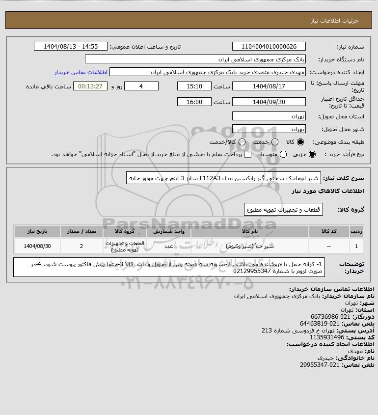 | 1 | -- | شیر خلأ (شیر وکیوم) | عدد | قطعات و تجهیزات تهویه مطبوع | 2 | 1404/08/30 |
