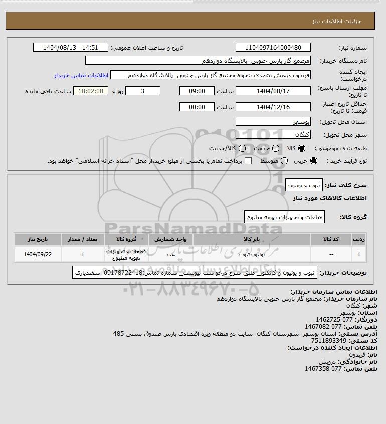استعلام بها و موضوع استعلام استعلام تیوب و یونیون به اطلاع کلیه شرکتها و افراد متخصص واجد شرایط میرساند، آگهی گذار در نظر دارد از طریق استعلام بها، نسبت به انتخاب و دریافت پیشنهادات اقدام نماید. این استعلام با کد آگهی ثبت شده در سامانه خبرگزاری پارس نماد : 9801683 منتشر شده است. مشخصات استعلام : تاریخ شروع استعلام: 1404/08/13 آخرین مهلت ارسال پیشنهاد قیمت : 1404/08/17 و محل اجرای پروژه : استان بوشهر میباشد. استعلام قیمت مورد درخواست : استعلام تیوب و یونیون با دستهبندیهای تخصصی و گروه های مرتبط : تاسیسات ساختمانی, لوله و اتصالات, تجهیزات نفت و گاز, استعلام اطلاع رسانی میگردد.