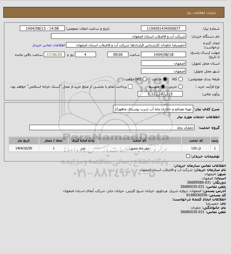 شرح کلی نیاز: تهیه مصالح و حفاری چاه آب شرب روستای ماهورک