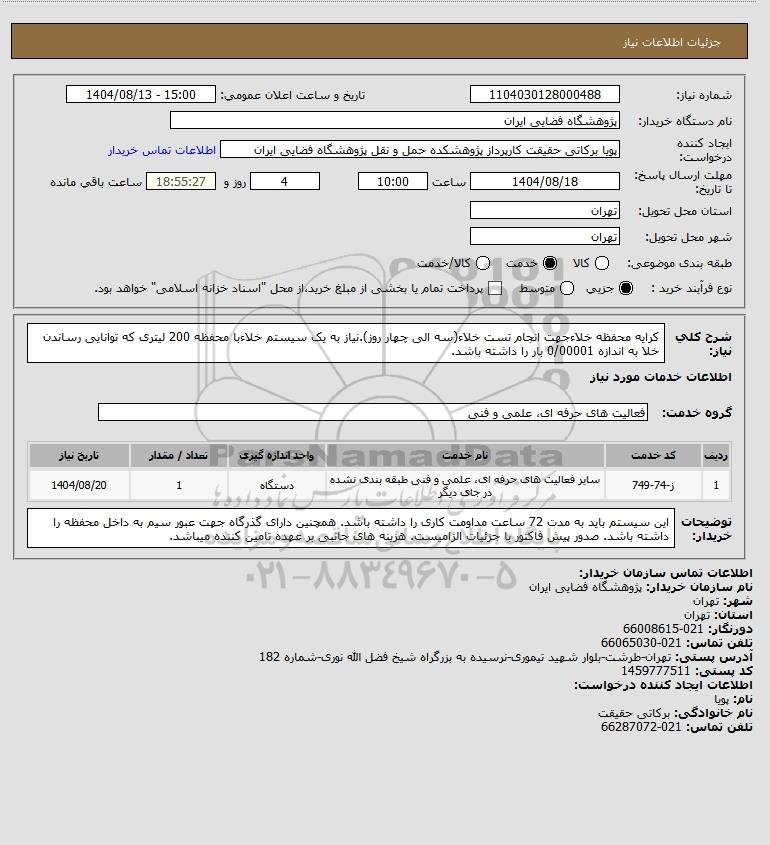 شرح کلی نیاز: کرایه محفظه خلاءجهت انجام تست خلاء(سه الی چهار روز).نیاز به یک سیستم خلاءبا محفظه 200 لیتری که توانایی رساندن خلا به اندازه 0/00001 بار را داشته باشد.