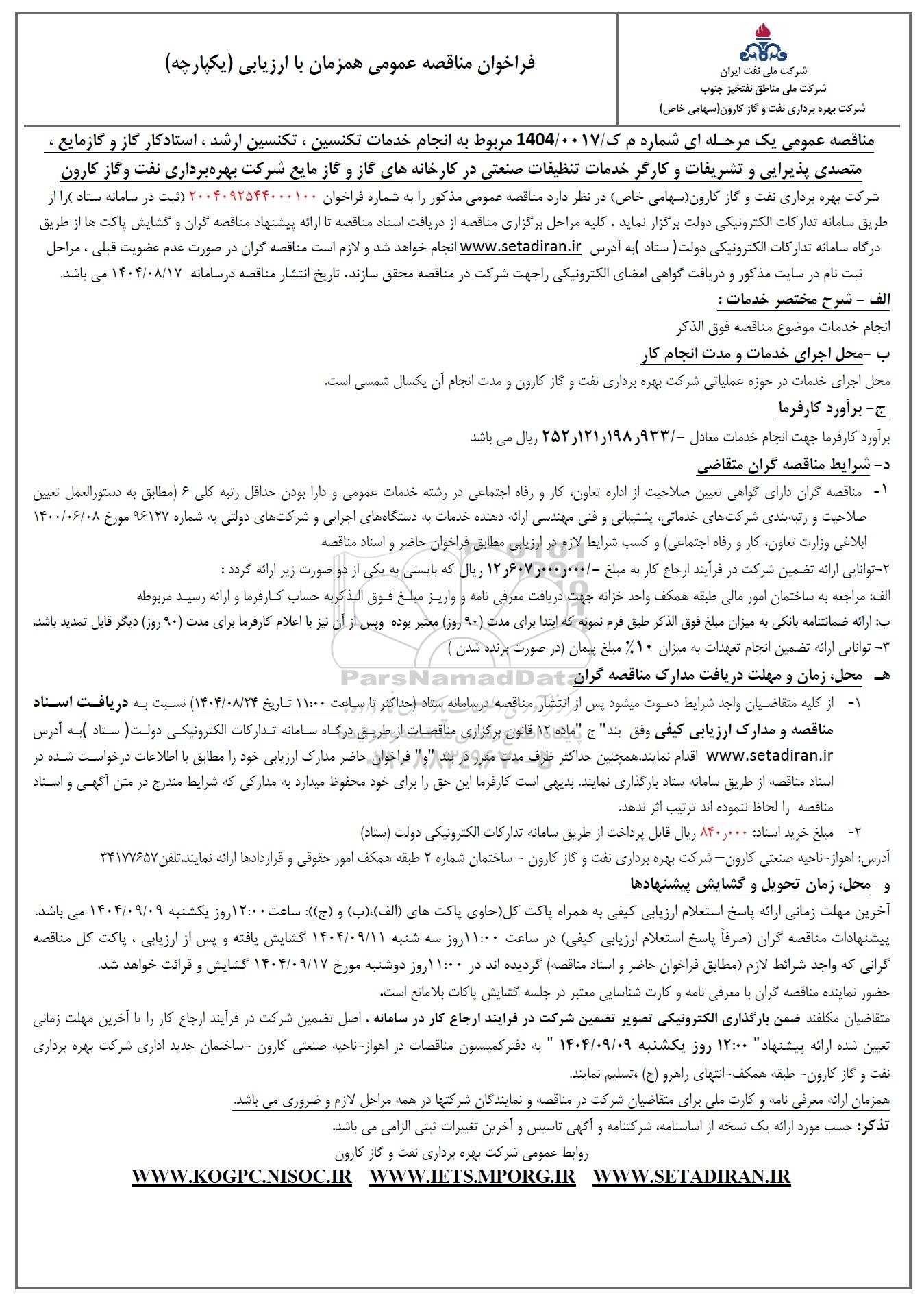 مناقصه عمومی یک مرحله ای شماره م ک / 1404/0017 مربوط به انجام خدمات تکنسین ، تکنسین ارشد ، استاد کار گاز و گاز مایع ، متصدی پذیرایی و تشریفات و کارگر خدمات تنظیفات صنعتی در کارخانه های گاز و گاز مایع شرکت بهره برداری نفت و گاز کارون