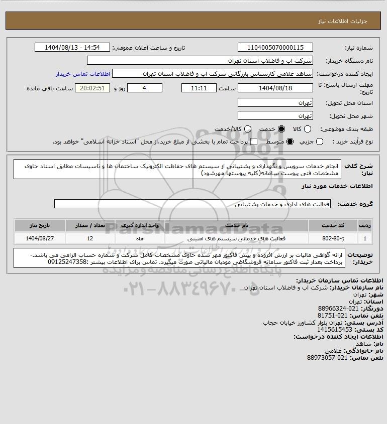 شرح کلی نیاز: انجام خدمات سرویس و نگهداری و پشتیبانی از سیستم های حفاظت الکترونیک ساختمان ها و تاسیسات مطابق اسناد حاوی مشخصات فنی پیوست سامانه(کلیه پیوستها مهرشود)