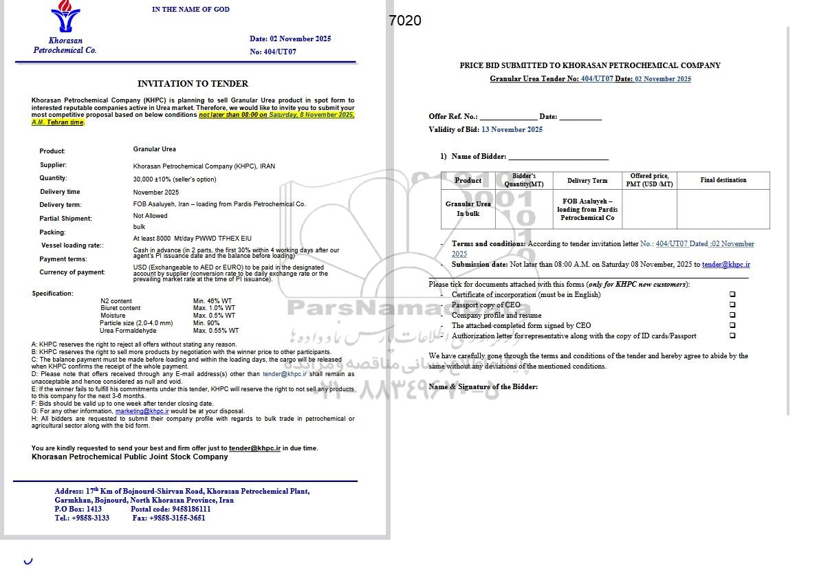 Khorasan Petrochemical Company (KHPC) is planning to sell Granular Urea product in spot form to interested reputable companies active in Urea market. Therefore, we would like to invite you to submit your most competitive proposal based on below conditions norlater than 08:00 on Saturday, 8 November 2025, A.M. Tehran time.