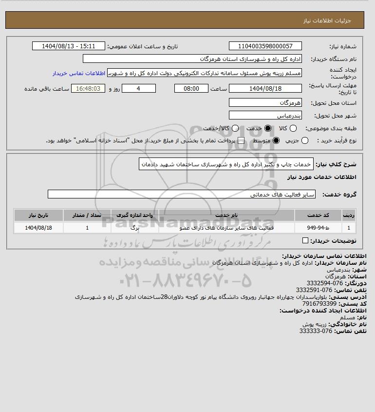 استعلام خدمات چاپ و تکثیر اداره کل راه و شهرسازی ساختمان شهید دادمان, استعلام خدمات چاپ و تکثیر اداره کل راه و شهرسازی ساختمان شهید دادمان