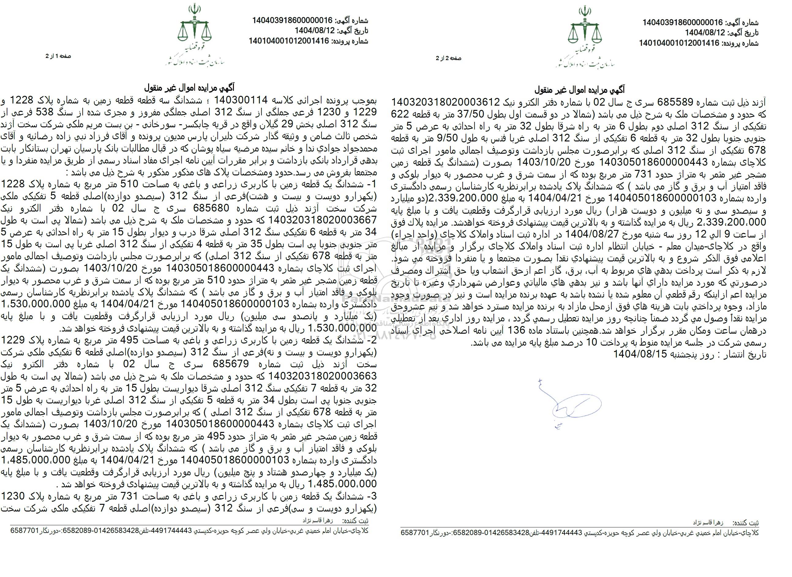 -1 ششدانگ یک قطعه زمین با کاربری زراعی و باغی به مساحت 510 متر مربع به شماره پلاک 1228 یکهزار و دویست و بیست و هشت فرعی از سنگ 312 سیصد و دوازده اصلی قطعه 5 تفکیکی ملکی شرکت سخت آزند ذیل ثبت شماره 685680 سری ج سال 02 با شماره دفتر الکترو نیک 140320318020003667 که حدود و مشخصات ملک به شرح ذیل میباشد شمالا پی است به طول 34 متر به قطعه 6 تفکیکی سنگ 312 اصلی شرقا درب و دیوار بطول 15 متر به راه احداثی به عرض 5 متر جنوبی جنوبا پی است بطول 35 متر به قطعه 4 تفکیکی از سنگ 312 اصلی غربا پی است به طول 15 متر به قطعه 678 تفکیکی از سنگ 312 (اصلی که برابر صورت مجلس بازداشت و توصيف اجمالی مامور اجرای ثبت کلاچای بشماره 140305018600000443 مورخ 1403.10.20 بصورت ششدانگ یک قطعه زمین مشجر غير مثمر به متراژ حدود 510 متر مربع بوده که از سمت شرق و غرب محصور به دیوار بلوکی و فاقد امتیاز آب و برق و گاز میباشد) که ششدانگ پلاک یادشده برابر نظریه کارشناسان رسمی دادگستری وارده بشماره 140405018600000103 مورخ 1404.04.21 به مبلغ 1,530,000,000 یک میلیارد و پانصد و سی (میلیون ریال مورد ارزیابی قرار گرفت و قطعیت یافت و با مبلغ پایه 1,530,000,000 ریال به مزایده گذاشته و به بالاترین قیمت پیشنهادی فروخته خواهد شد. -2 ششدانگ یک قطعه زمین با کاربری زراعی و باغی به مساحت 495 متر مربع به شماره پلاک 1229 یکهزار و دویست و بیست و نه فرعی از سنگ 312 سیصد و دوازده اصلی قطعه 6 تفکیکی ملکی شرکت سخت آزند ذیل ثبت شماره 685679 سری ج سال 02 با شماره دفتر الکترو نیک 140320318020003663 که حدود و مشخصات ملک به شرح ذیل میباشد شمالا بی است به طول 32 متر به قطعه 7 تفکیکی سنگ 312 اصلی شرقا دیواریست بطول 15 متر به راه احداثی به عرض 5 متر جنوبی جنوبا پی است بطول 34 متر به قطعه 5 تفکیکی از سنگ 312 اصلی غربا دیواریست به طول 15 متر به قطعه 678 تفکیکی از سنگ 312 اصلی ( که برابر صورت مجلس بازداشت و توصيف اجمالي مامور اجرای ثبت کلاچای بشماره 140305018600000443 مورخ 1403.10.20 بصورت ششدانگ یک قطعه زمین مشجر غیر مثمر به متراز حدود 495 متر مربع بوده که از سمت شرق و غرب محصور به دیوار بلوکی و فاقد امتیاز آب و برق و گاز میباشد ) که ششدانگ پلاک یاد شده برابر نظریه کارشناسان رسمی 1,485.000.000 دادگستری وارده بشماره 140405018600000103 مورخ 1404.04.21 به مبلغ یک میلیارد و چهار صد و هشتاد و پنج میلیون ریال مورد ارزیابی قرار گرفت و قطعیت یافت و با مبلغ پایه 1.485.000.000 ریال به مزایده گذاشته و به بالاترین قیمت پیشنهادی فروخته خواهد شد .