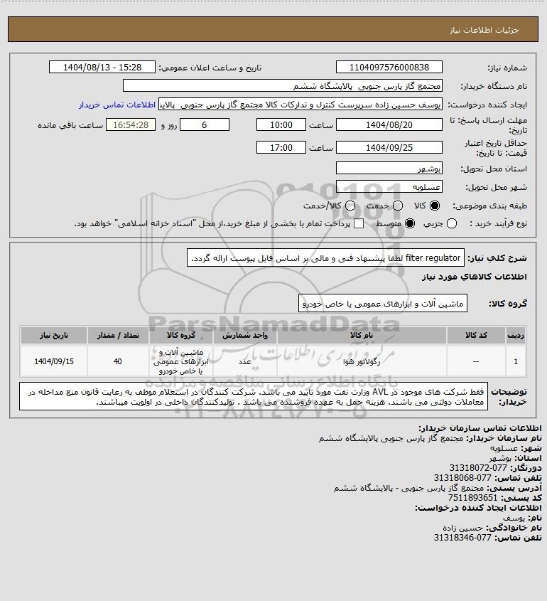 | 1 | -- | رگولاتور هوا | عدد | ماشین آلات و ابزارهای عمومی یا خاص خودرو | 40 | 1404/09/15 |