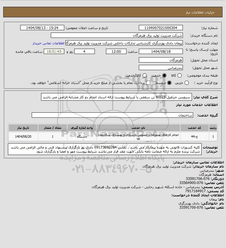 شرح کلی نیاز: سرویس جرثقیل 80/25 تن سقفی با شرایط پیوست ارائه اسناد انجام دو کار مشابه الزامی می باشد