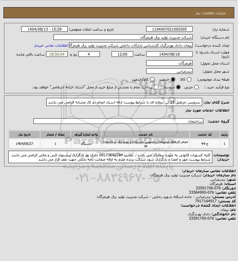 شرح کلی نیاز: سرویس جرثقیل 35 تن دروازه ای با شرایط پیوست ارائه اسناد انجام دو کار مشابه الزامی می باشد