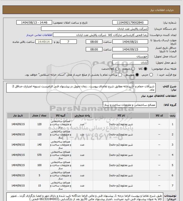 شرح کلی نیاز: شیرآلات حمام و آشپزخانه مطابق شرح تقاضای پیوست . زمان تحویل در پیشنهاد فنی الزامیست تسویه اعتباری حداقل 2 ماه.