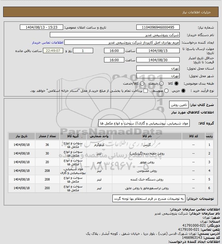 | 4 | -- | روغن مصنوعی | لیتر | مواد شیمیایی، بیوشیمیایی و گازی | 208 | 1404/08/18 |