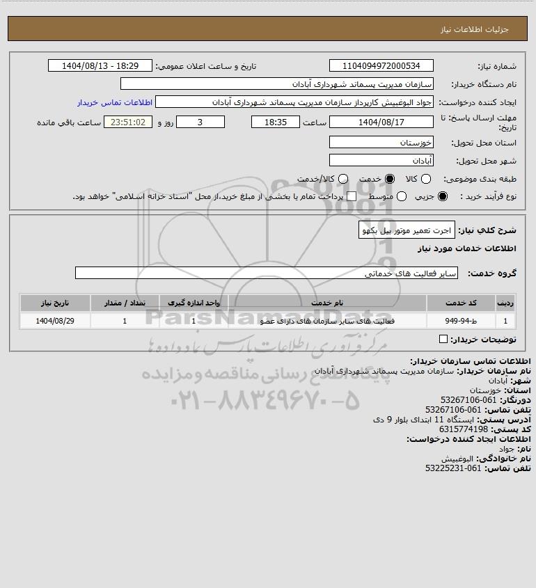 شرح کلی نیاز: اجرت تعمیر موتور بیل بکهو