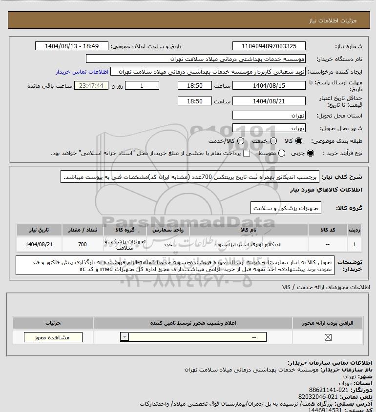 شرح کلی نیاز: برچسب اندیکاتور بهمراه ثبت تاریخ پرینتکس 700عدد (مشابه ایران کد)مشخصات فنی به پیوست میباشد.