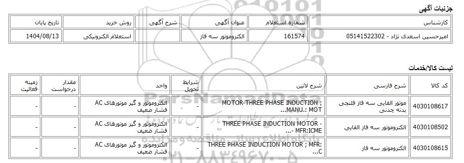 | امیرحسین اسعدی نژاد - 05141522302 | 161574 | الکتروموتور سه فاز | استعلام الکترونیکی | 1404/08/13 |