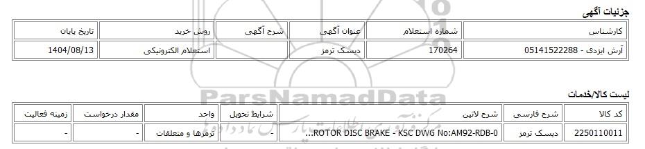 | آرش ایزدی - 05141522288 | 170264 | دیسک ترمز | استعلام الکترونیکی | 1404/08/13 |