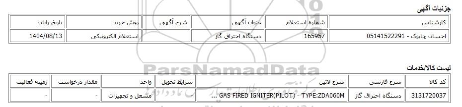 | احسان چابوک - 05141522291 | 165957 | دستگاه احتراق گاز | استعلام الکترونیکی | 1404/08/13 |