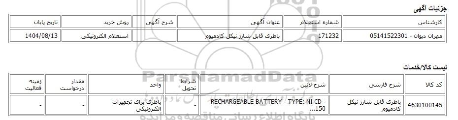| مهران دیوان - 05141522301 | 171232 | باطری قابل شارژ نیکل کادمیوم | استعلام الکترونیکی | 1404/08/13 |