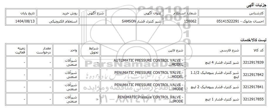 | احسان چابوک - 05141522291 | 158062 | شیر کنترل فشار SAMSON | استعلام الکترونیکی | 1404/08/13 |