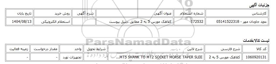| محمد جاودان مهر - 05141522318 | 172532 | کلاهک مورس 5 به 2 مطابق دیتیل پیوست | استعلام الکترونیکی | 1404/08/13 |