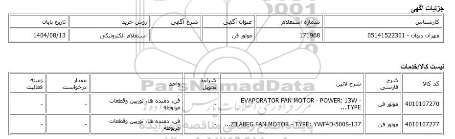 | مهران دیوان - 05141522301 | 171968 | موتور فن | استعلام الکترونیکی | 1404/08/13 |