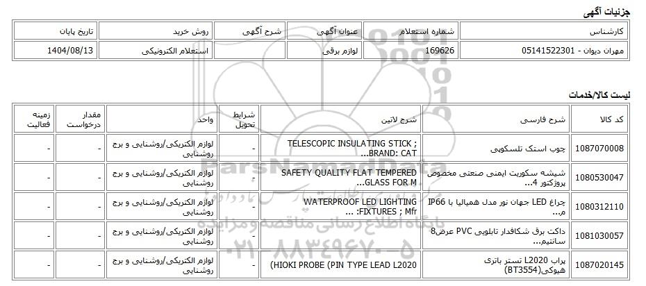 | مهران دیوان - 05141522301 | 169626 | لوازم برقی | استعلام الکترونیکی | 1404/08/13 |