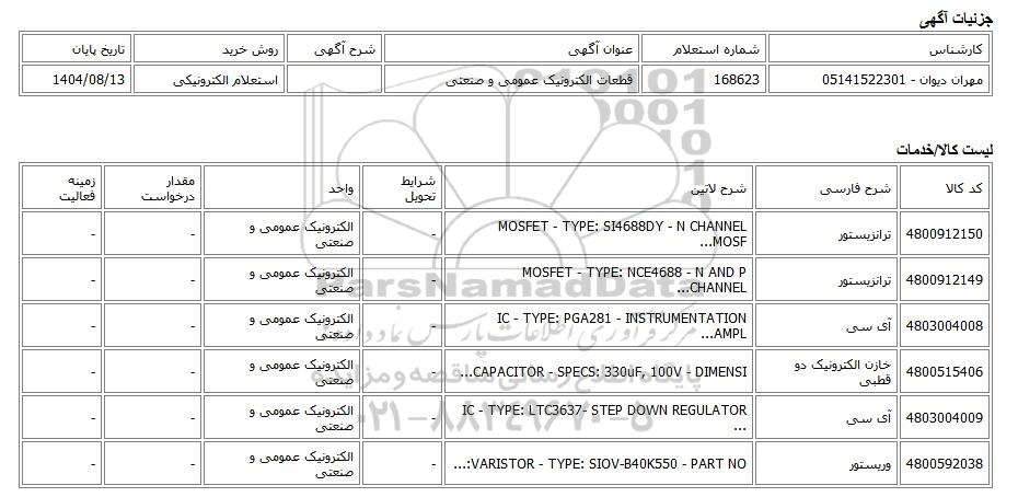 | مهران دیوان - 05141522301 | 168623 | قطعات الکترونیک عمومی و صنعتی | استعلام الکترونیکی | 1404/08/13 |