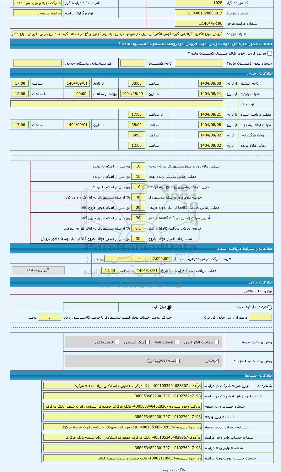 مزایده عمومی مزایده فروش انواع الکترود گرافیتی کوره قوس الکتریکی نیپل دار موجود در طرح کمک به تأمین زیربناهای واحد فرآوری تیتانیوم کهنوج وا برگزار میگردد. از کلیه افراد متخصص و شرکتهای واجد شرایط دعوت به عمل میآید تا در این مزایده با کد خبرگزاری پارس نماد : 9802620 شرکت نمایند تاریخ شروع مزایده : 1404/08/08 مهلت شرکت در مزایده: تا پایان روز 1404/08/21 مکان برگزاری اموال واگذاری استانهای مزایدات استان کرمان و دستهبندیهای مربوط به این حراجی الکترود, استیل و اهن نسوز میباشد.