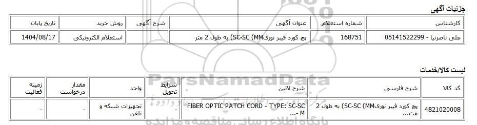 | علی ناصرنیا - 05141522299 | 168751 | پچ کورد فیبر نوریSC-SC (MM) به طول 2 متر | استعلام الکترونیکی | 1404/08/17 |
