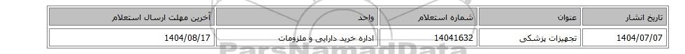 1404/07/07تجهیزات پزشکی14041632اداره خرید دارایی و ملزومات1404/08/17