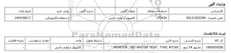 | علی ناصرنیا - 05141522299 | 172424 | کامپیوتر و لوازم جانبی | استعلام الکترونیکی | 1404/08/17 |
