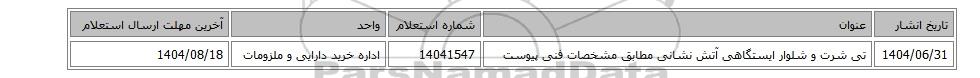 استعلام بها و موضوع استعلام استعلام، تی شرت و شلوار ایستگاهی آتش نشانی مطابق مشخصات فنی پیوست به اطلاع کلیه شرکتها و افراد متخصص واجد شرایط میرساند، آگهی گذار در نظر دارد از طریق استعلام بها، نسبت به انتخاب و دریافت پیشنهادات اقدام نماید. این استعلام با کد آگهی ثبت شده در سامانه خبرگزاری پارس نماد : 9803189 منتشر شده است. مشخصات استعلام : تاریخ شروع استعلام: 1404/08/14 آخرین مهلت ارسال پیشنهاد قیمت : 1404/08/18 و محل اجرای پروژه : استان تهران میباشد. استعلام قیمت مورد درخواست : استعلام، تی شرت و شلوار ایستگاهی آتش نشانی مطابق مشخصات فنی پیوست با دستهبندیهای تخصصی و گروه های مرتبط : البسه و پوشاک, سیستم ایمنی ، اتش نشانی،اعلام و اطفای حریق, استعلام اطلاع رسانی میگردد.