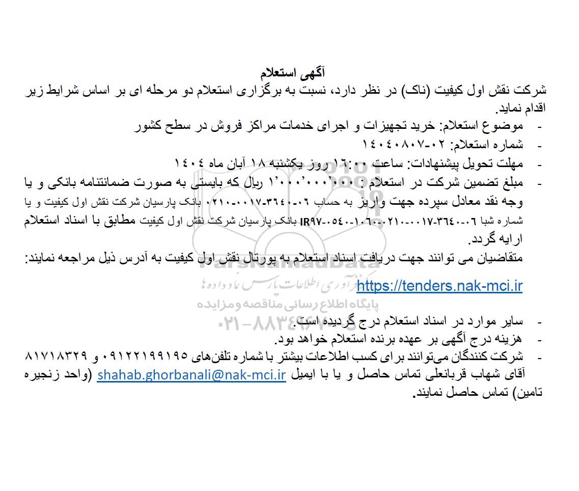 - موضوع استعلام: خرید تجهیزات و اجرای خدمات مراکز فروش در سطح کشور