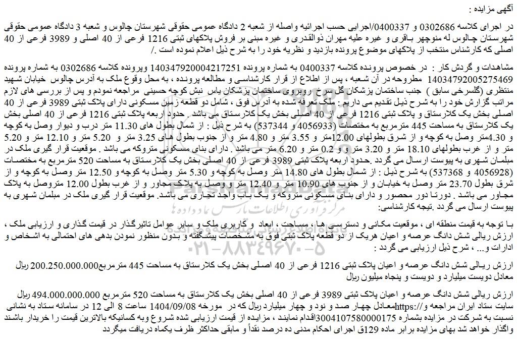در اجرای کلاسه 0302686 و 0400337/اجرایی حسب اجرائیه واصله از شعبه 2 دادگاه عمومی حقوقی شهرستان چالوس و شعبه 3 دادگاه عمومی حقوقی شهرستان چالوس له منوچهر باقری و غیره علیه مهران ذوالقدری و غیره مبنی بر فروش پلاکهای ثبتی 1216 فرعی از 40 اصلی و 3989 فرعی از 40 اصلی که کارشناس منتخب از پلاکهای موضوع پرونده بازدید و نظریه خود را به شرح ذیل اعلام نموده است ./